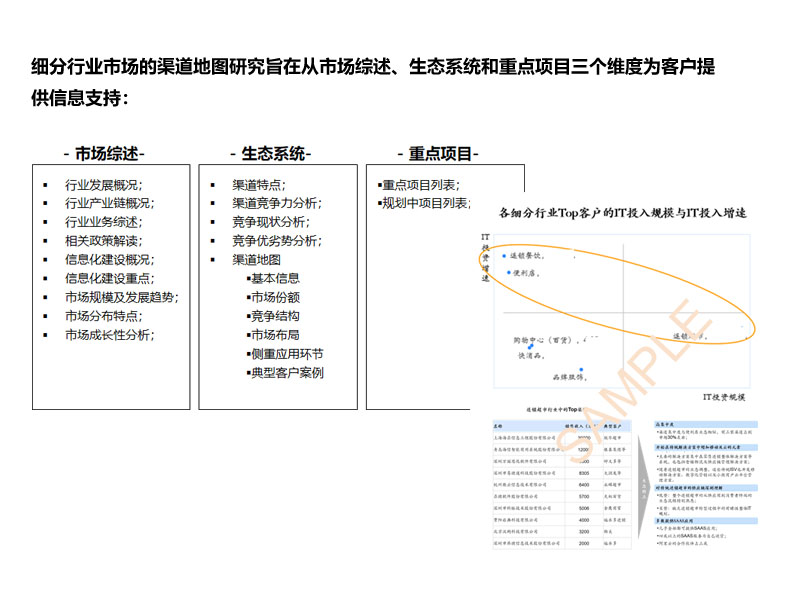針對客戶特定的業務需求開展專項市場研究,輸出專項研究報告,并提供報告匯報。常見的專項研究項目如生態系統滿意度研究、生態系統監測研究等。