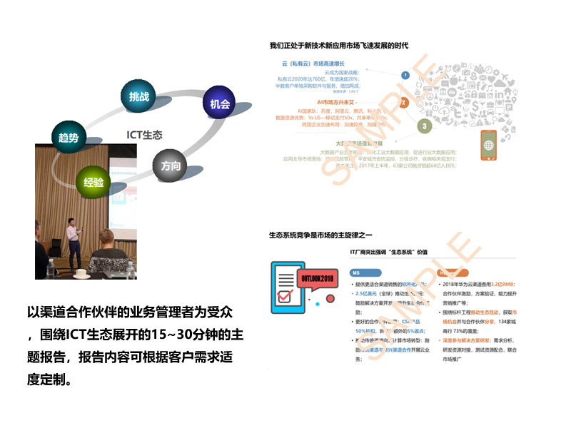 圍繞生態建設實務為客戶提供的專項服務,包含生態機會定向挖掘基礎服務、生態機會定向挖掘標準服務、渠道會議主題內容輸出、小型生態研討會組織及內容輸出等。